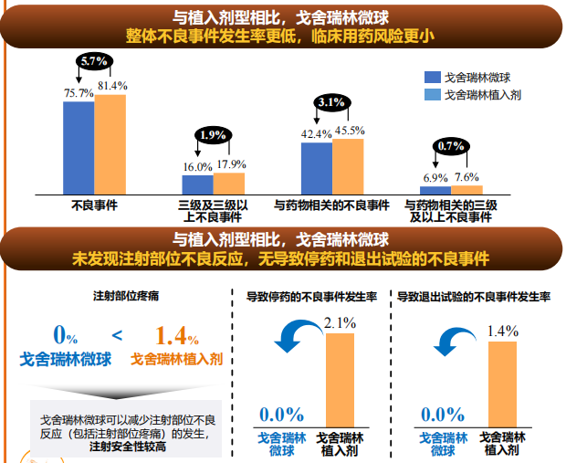 作為全球首個(gè)且唯一獲批的戈舍瑞林微球產(chǎn)品,百拓維從關(guān)鍵輔料到制劑均為我國(guó)自主研發(fā),且采用了二代乳化溶劑揮發(fā)法更新工藝,實(shí)現(xiàn)了高達(dá)90%以上的藥物包封率和批次間高穩(wěn)定性,并改善藥物的釋放效果。該產(chǎn)品打破了20多年來進(jìn)口戈舍瑞林植入劑的壟斷地位,而且沒有單純仿制早先上市、不夠先進(jìn)的微球制劑,而是選擇走劑型改良的開發(fā)策略。目前注射用戈舍瑞林微球用于前列腺癌的臨床III期研究論文已公布,從研究結(jié)果來看,注射用戈舍瑞林微球的去勢(shì)成功率與戈舍瑞林植入劑相當(dāng):該研究采用非劣效性設(shè)計(jì),治療29天時(shí)(起始治療后的第2次注射)兩組去勢(shì)患者比例分別為99.3%和100%,維持至第85天時(shí)(起始治療后第3次注射)的比例則分別為99.3%和97.8%,注射用戈舍瑞林微球療效達(dá)到非劣于戈舍瑞林植入劑的標(biāo)準(zhǔn)。在主要終點(diǎn)及其它次要終點(diǎn)表現(xiàn)相當(dāng)?shù)那闆r下,注射用戈舍瑞林微球組患者注射部位不良反應(yīng)(如疼痛、紅腫等)發(fā)生率顯著低于戈舍瑞林植入劑組(0 vs. 1.4%),證實(shí)了其改善患者治療體驗(yàn)的價(jià)值,畢竟傳統(tǒng)植入劑注射針頭有1.6毫米粗,而注射用戈舍瑞林微球針頭外徑僅為0.8毫米,改善顯而易見;此外,研究中也未發(fā)現(xiàn)與注射用戈舍瑞林微球治療相關(guān)、并導(dǎo)致停藥和退出研究的不良事件[7]。復(fù)旦大學(xué)附屬腫瘤醫(yī)院副院長(zhǎng)、泌尿腫瘤 MDT 首席專家葉定偉教授指出,注射用戈舍瑞林微球在臨床療效和安全性與植入劑型一致,注射方式、患者體驗(yàn)更佳,為前列腺癌臨床治療提供了更多選擇。