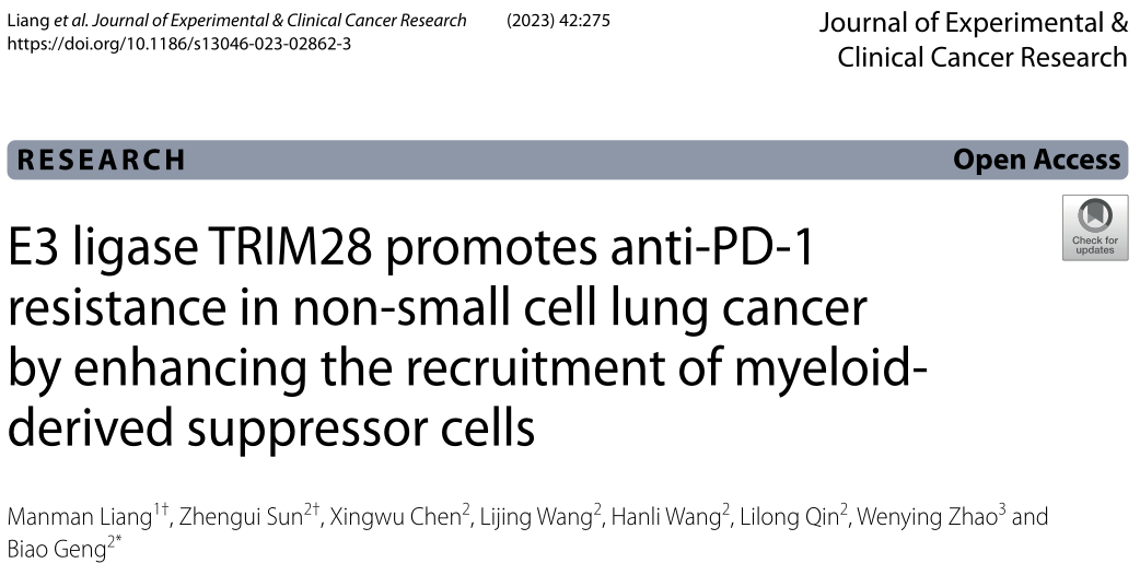近日,來自皖南醫(yī)學(xué)院的研究者們在J Exp Clin Cancer Res.雜志上發(fā)表了題為“E3 ligase TRIM28 promotes anti-PD-1 resistance in non-small cell lung cancer by enhancing the recruitment of myeloid-derived suppressor cells” 的文章,該研究表明TRIM28通過ripk1介導(dǎo)的NF-κB激活,作為趨化因子驅(qū)動(dòng)的MDSCs募集的啟動(dòng)子,導(dǎo)致浸潤性活化CD8+T細(xì)胞受到抑制,并產(chǎn)生抗pd -1耐藥性。